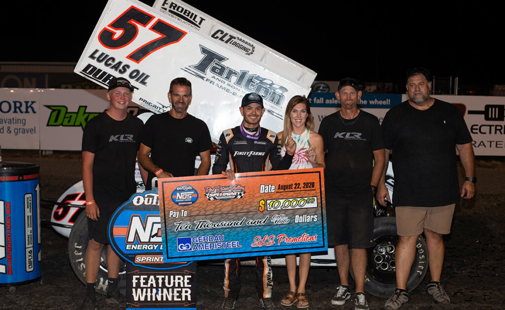 When he went low, Larson went high. And it benefited Larson the most. While ripping the top through Turns 1 and 2 with seven laps to go, Larson blazed around the outside of Sweet. He reclaimed his crown as the leader and held on to it for the final six laps without any challenges to pick up the $10,000 check, his third World of Outlaws win in-a-row and ninth win with the Series this season.