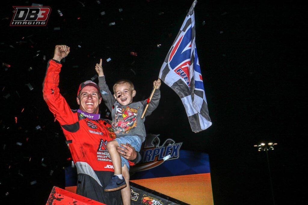 Jason Johnson stands a top his sprint car with his son, Jaxx, after winning a race at the Jackson Motorplex. Photo by DB3 Imaging.