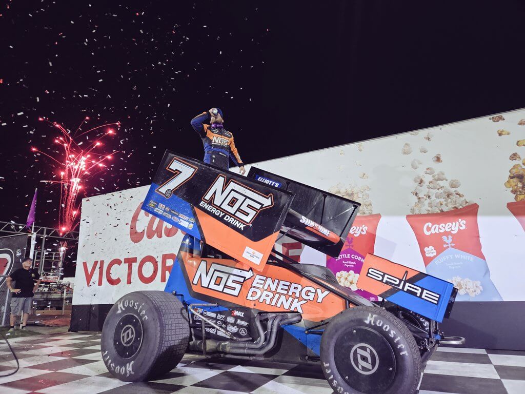 A main (started), 30 Laps, NT: 1. 7BC, Tyler Courtney, Indianapolis, IN (2); 2. 27A, Emerson Axsom, Franklin, IN (1); 3. 88, Austin McCarl, Altoona, IA (4); 4. 21, Brian Brown, Grain Valley, MO (9); 5. 8, Cory Eliason, Visalia, CA (3); 6. 1TAZ, Tasker Phillips, Pleasantville, IA (6); 7. 4w, Jamie Ball, Knoxville, IA (5); 8. 21T, Cole Macedo, Lemoore, CA (12); 9. 6, Kaleb Johnson, Sioux Falls, SD (8); 10. 88, Terry McCarl, Altoona, IA (10); 11. 95, Matt Covington, Glenpool, OK (16); 12. 55, Kerry Madsen, St. Mary’s, NSW, Aust. (19); 13. 27H, Justin Peck, Monrovia, IN (15); 14. 87, Aaron Reutzel, Clute, TX (17); 15. Carson McCarl (24); 16. Kasey Kahne (22); 17. Ryan Giles (23); 18. 35, Skylar Prochaska, Lakefield, MN (20); 19. 24, Kade Higday, Knoxville, IA (11); 20. 26, Zeb Wise, Angola, IN (16); 21. 15H, Sam Hafertepe Jr., Sunnyvale, TX (13); 22. 17, Tyler Groenendyk, Oskaloosa, IA (7); 23. Chase Randall (21) DNS – 24. 27B, Jake Bubak, Arvada, CO (14). Lap Leaders: Courtney 1, Axsom 2-11, Courtney 12-30. MPi Hard-charger: C. McCarl.